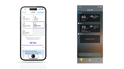In den Apps von Bosch (links) und Shimano (rechts) können die neuen Funktionen nach eigenem Gusto und Einsatzbereich eingestellt werden.