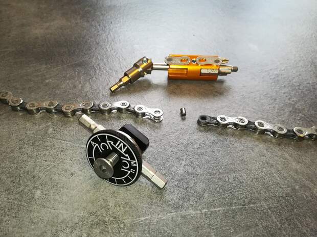 Unsichtbar und geschickt: Den Namen für sein smartes Tool hat Topeak gut gewählt! Das Ninja C wird im Lenker versteckt, im Falle eines Kettenrisses lässt sich der Nieter aus dem Lenker ziehen und im 90°-Winkel abklappen. Dann beginnt der Ninja mit seiner Arbeit: Der wer- tige Kettennieter wird via 4-mm-Inbus bedient und knackt beschädigte Kettenglieder in Windeseile. Nützlich für die hakeligen Arbeiten am Antrieb ist die Kettenklammer, die sich im anderen Lenkerende verbergen lässt. Ersatznietstifte lassen sich hier auch geschickt verstauen. Gewicht des pfiffigen Paars? 77 Gramm.