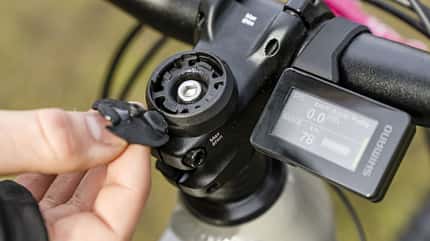 Unter der Kappe des Steuersatzdeckels verbirgt sich ein Adapter für Endgeräte wie Garmin & Co.