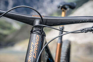 Trotz mühsamer Abstimmarbeiten konnte uns der Hinterbau sowohl bei den Testfahrten in Davos als auch auf unseren Hometrails nicht ganz überzeugen. Schon früh geht das Heck in die Endprogression. Probeweise verbauten wir einen Stahlfederdämpfer, der uns deutlich besser im Heck des Neulings gefiel. In der Abfahrt vermittelt das Unno generell aber viel Sicherheit, auch der hohen Front sei Dank. Gewöhnungsbedürftig ist der ultrakurze Vorbau. Zwar ist die Lenker-Vorbau-Einheit schick, doch das Vorderrad reagiert auch auf jede noch so kleine Lenkbewegung. Die Geometrie ist aber generell auf der modernen, laufruhigen Seite, der Rahmen fühlt sich zudem hochsteif an. Auch bergauf setzt das Unno die Kraft aufs Pedal gut um, zudem zeigt sich der Hinterbau angenehm antriebsneutral, die Sitzposition gefällt ebenso.