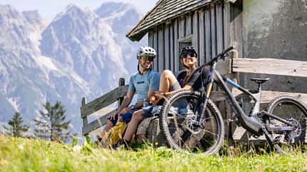 Tourenspaß – gut bei Kräften haben wir uns die "Lärchfilzhochalm-Tour" (Nr. 256) für den Rest des Tages ausgesucht. Die Hausrunde von Fieberbrunn am Fuße des Wildseeloders bietet auf 19 Kilometern und bei rund 800 Höhenmetern urige Hütten – und den Sprung in einen Badesee. Von Fieberbrunn aus biken wir an der Ache entlang Richtung Eiserne Hand/Lärchfilzhochalm, ehe wir auf halber Strecke abbiegen und der Straße hinauf folgen. Weiter geht es über die Grießenbodenalm Richtung Lärchfilzkogel. Ab der Weggabelung in der Senke folgt ein "Shared Trail": Rücksicht auf Wanderer nehmen, Tempo anpassen! Am Gasthof Wildalpgatterl vorbei fahren wir links über die Wiese. Die ersten Kurven gen Zillstattalm sind knifflig, ehe wir genüsslich dem Schotterweg bis zur Asphaltstraße folgen, wo bald das kühle Nass des Lauchsees wartet.