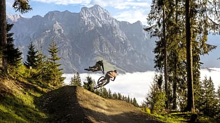 Von leicht bis schwer – "Gateway" heißt eine der neuen Strecken, die sich für den Start in den Tag ideal anbietet. Sie verbindet die Mittelstation der Steinbergbahn mit der beliebten "Steinberg Line by Fox". Die Strecke führt auf 600 Metern über Holzstege und durch landschaftlich herrliche Abschnitte. Natürlich wählen wir danach die erwähnte, ebenfalls leichte "Steinberg-Line", ehe wir – weiter im blauen Bereich – den "Hangman II" anhängen. Apropos: Der weiter oben startende Namensvetter "Hangman I" wurde mit neuen Varianten in Schwarz und Rot aufgewertet. Die knackig-schwere schwarze Variante hat sich dabei den Namen "Hangover” verdient, der aus einem Voting auf Instagram entstanden ist. Auch die Bezeichnung einer weiteren Novität entstammt der Social-Media-Community. Der naturbelassene Trail "Back to the Roots" bietet auf 1,3 Kilometern ein Wurzelfeuerwerk. Wer so etwas liebt, der sollte sich am Nachmittag dann den Natur-Trails widmen: Klassiker wie die mittelschweren Trails "Alte-Schmiede" und "Asitz" bieten ebenso unvergessliche Fahrfreude wie die schweren, spannenden Pfade "Matzalm" und "Forsthof".