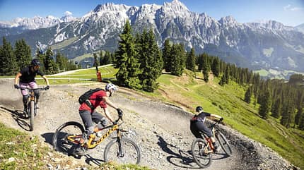 Von hart bis zart: Während die gebauten Strecken, wie im großen Bild in Leogang, alle Könnensstufen ansprechen ,locken auch Genusstouren in die Region.