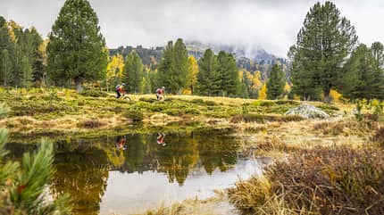 Im Rausch der Farben: Die leuchtend gelben Zirben, aber auch das welke, orange-braune Gras verleihen der herbstlichen Landschaft einen besonderen Zauber.