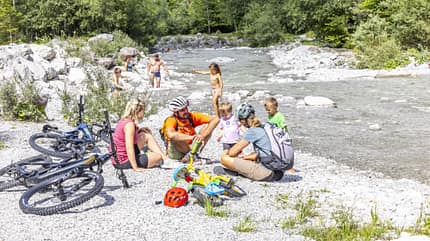 Schöner kann ein Gewässer kaum liegen als der Hintersee am Fuß des Hochkaltermassivs. Aber wir haben noch ein Date heute Nachmittag. So brausen wir am Weißbach entlang ins Tal und am Tauernradweg weiter bis zum Naturbadegebiet Vorderkaser. Hier finden wir einen Traum für alle Naturliebhaber und Familien vor. So treffen wir hier an einem der kristallklaren Wasserbecken, umgeben von einer atemberaubenden Naturkulisse, auch die Familie von Martin beim Sonntagsausflug.