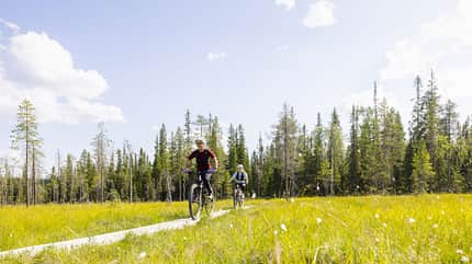 ⛰️ Lage & Charakter: Die Region Syöte und der namensgleiche Nationalpark liegen etwa 150 Kilometer südlich von Rovaniemi und bilden das südlichste Fjell, also Mittelgebirge, Finnlands. Iso-Syöte ist das beliebteste Skigebiet des Landes, dort befindet sich auch der empfehlenswerte Bikepark. In der weitläufigen Hügellandschaft verlaufen zahlreiche meist naturbelassene Trails, die zum Mountainbiken freigegeben sind. Grundsätzlich gilt, dass die zwar meist zahmen Wege durch das ständige Auf und Ab und viele Wurzeln konditionell mehr fordern, als es die Höhenmeter vermuten lassen.