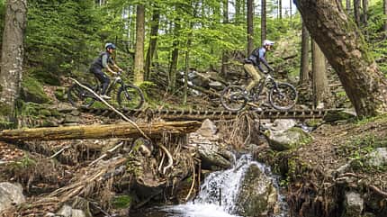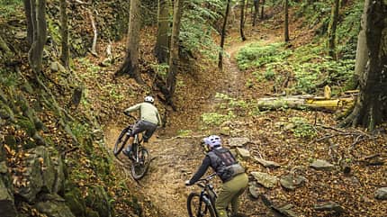 Schwung mitnehmen ist das A und O auf der reizvollen Trojak-Schleife bei Ladek-Zdrój mit seinen superlangen Rockgardens bergab und bergauf.