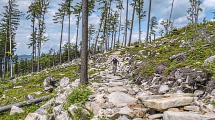 Weiter geht’s mit der Transferetappe von Złoty Stok nach Ladek-Zdrój. Eine landschaftlich eindrucksvolle Tour durch duftende Bärlauchmeere, vorbei an Aussichtspunkten und hinunter über die abwechslungsreichen Trails des Glacensis-Netzwerks bis in den Kurort Ladek-Zdrój. Die Trojak-Schleife mit Steinfeld und Panorama setzt das i-Tüpfelchen.