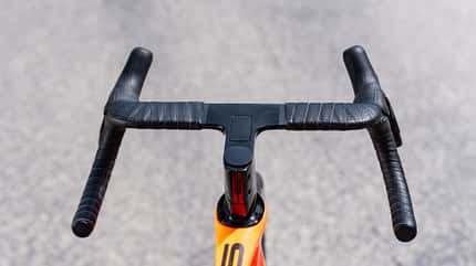 Das erste Detail notieren wir schon beim Aufsatteln: An unserem Testrad treibt das Fascenario.5 den Trend zu schmalen Lenkern auf die Spitze. Gerade mal 32 Zentimeter messen wir am Oberlenker (Mitte–Mitte) des RBSU-Fascenario.5-Cockpits. Die nach innen gedrehten Bremshöcker trennen gar nur 29 Zentimeter. Wenn das die UCI sehen würde ... Immerhin weist der Lenker einen deutlichen Flare von 19° auf, was im Unterlenker eine deutlich bessere Radkontrolle erlaubt.